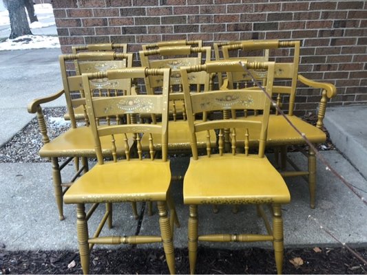 8 vintage Hitchcock Chairs made by Nichols & Stone in mustard yellow. Charming for breakfast or informal dining or extra holiday seating. Gilt stenciling intact, sturdy, in very good condition for 50 plus years. 3 arm and 5 side chairs. Will separate